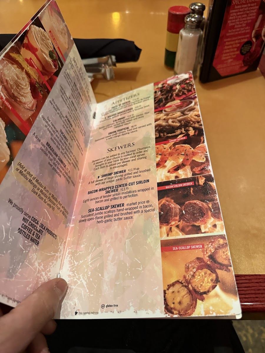 Specialty skewers can be added to any Tucanos' Churrasco. A skewer of your choice is cooked to order andbrought to your table by your meat server. Each item is priced per skewer and sharing is encouraged.Cooking times vary and availability is limited.